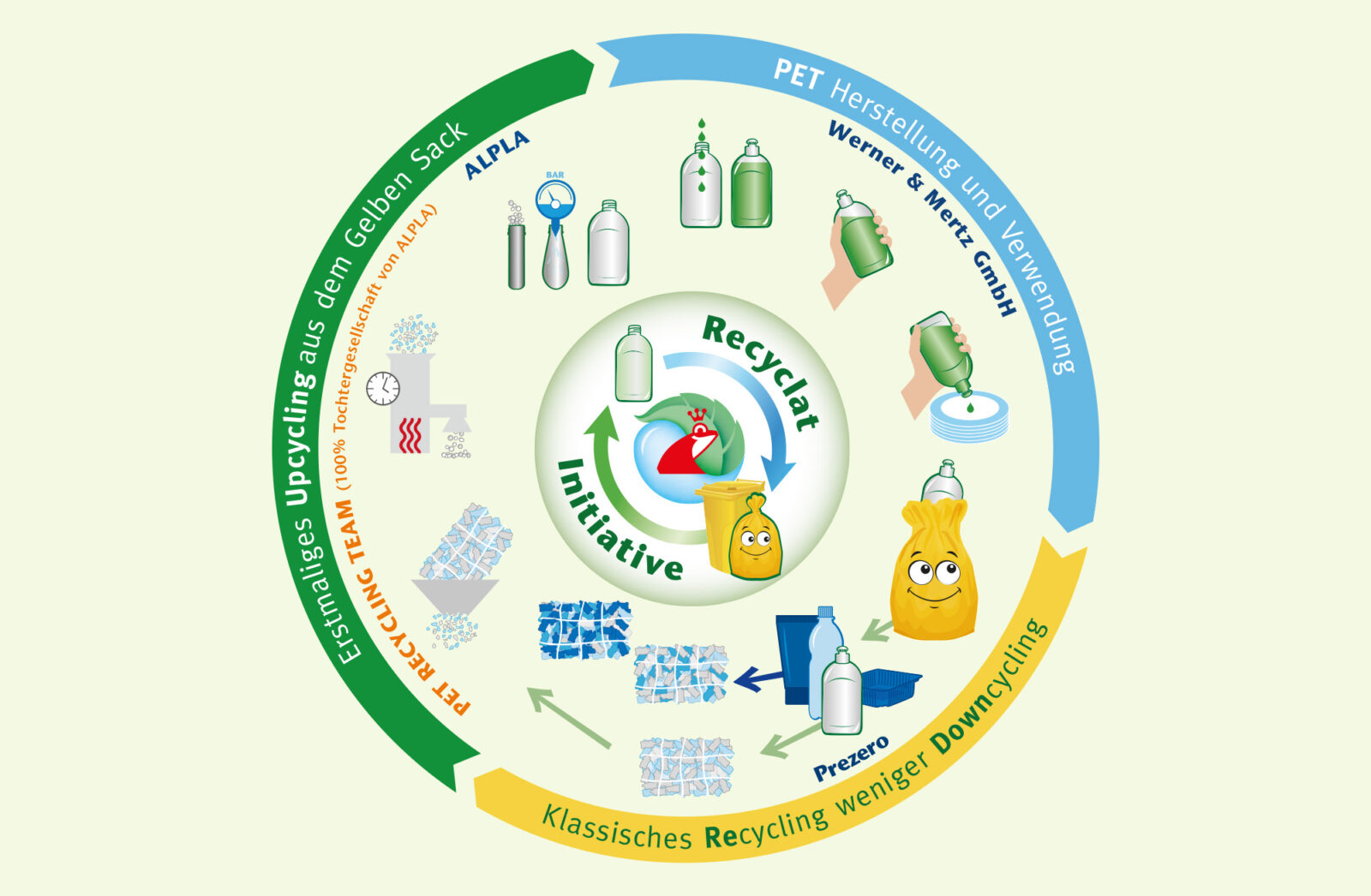 Dabei kann Kunststoff umweltfreundlicher sein als viele andere Materialien – wenn wir richtig damit umgehen. Die Recyclat-Initiative von Werner & Mertz hat 2012 begonnen, eine Lösung dafür voranzubringen: Die hochwertige Wiederverwertung von Kunststoffen mittels mechanischem Recycling. Der Gelbe Sack als Sammelsystem solcher Verpackungen ist die Quelle, aus der „Wir für Recyclat“ seine Rohstoffe für neues Verpackungsmaterial gewinnt. Das Plastik aus dem Gelben Sack wird mithilfe von Kooperationspartnern entlang der gesamten Wertschöpfungskette energieschonend und damit klimafreundlich hochwertig aufbereitet und dann in hoher Qualität in neuen Verpackungen eingesetzt. Dadurch bleibt der Kunststoff im Kreislauf, wodurch die Umwelt gleich doppelt profitiert: Zum einen vermeidet es die Vermüllung von Landschaft und Meer, zum anderen schont es die natürlichen Ressourcen, weil nicht ständig neues Plastik nachproduziert werden muss.
